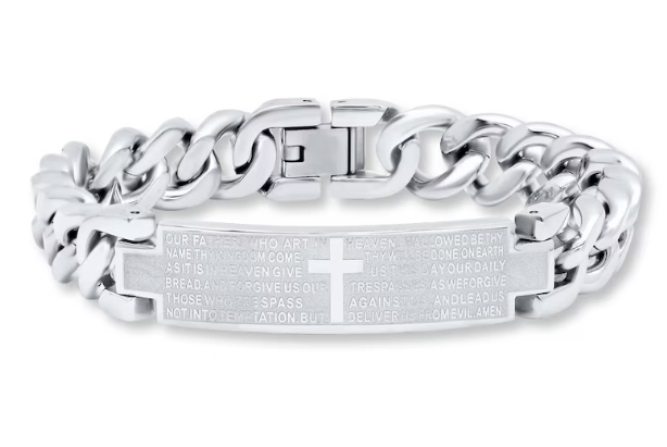 The Lord's prayer and a cross embellish a bar of stainless steel in this stainless steel bracelet. The 8.5-inch curb chain secures with a box clasp.