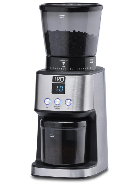 - Get consistent results with the TRU Large Capacity Conical Burr Grinder's digital countdown timer, ensuring precise grind times for perfect coffee every time