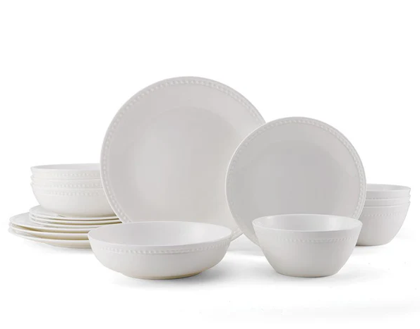 Loria dinnerware features a simplistic embossed bead design that wraps around the edge of each piece. Crafted of bone china. 16 piece dinnerware set, service for four, includes (4) each: 10-3/4 inch dinner plate, 8-1/4 inch salad plate, 6 inch diameter x 3 inch high (24 ounces) soup cereal bowl, and 8 inch diameter x 2 inch high (36 ounces) pasta bowl. Chip resistant, microwave and dishwasher safe.
