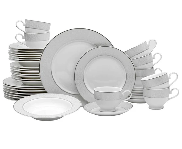 Parchment dinnerware collection features a gentle gray border embellished with a beautifully detailed scroll design. This chic and elegant collection is accented by inner and outer borders of platinum. Crafted of porcelain with metallic accent banding. Dishwasher safe. Not Microwave safe. This 40 piece set includes (8) each: 10-3/4 inch dinner plate, 8-1/4 inch salad plate, 8-1/2 inch rim soup bowl (12 ounce), 8 ounce tea cup and 6-1/2 inch tea saucer.