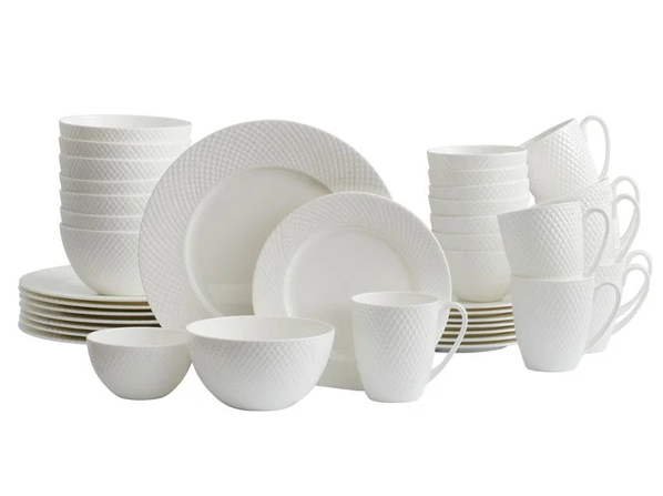 Stanton creates an eye-catching tabletop by combining classic white simplicity with modern design. A dramatic waffle pattern adorns each piece, creating depth and movement that will breathe new life into your dinner gatherings. Crafted from bone china. Microwave, dishwasher and freezer safe. 40 piece dinnerware set, service for eight, includes (8) each: 10-3/4 inch dinner plate, 8 inch salad plate, 5 inch diameter x 2-1/4 inch high (15 ounce) fruit bowl, 6-3/4 inch diameter (24 ounce) cereal bowl and 14 ounce mug.