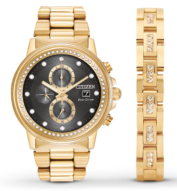This Nighthawk chronograph men's watch from Citizen showcases day-to-night style with its 42mm yellow-gold-tone stainless steel case surrounded by sparkling crystals, and crystal accents on the black dial and yellow-gold-tone stainless steel bracelet. Chronograph subdials measure up to 60 minutes of elapsed time, 12/24 hour time, and 1/5 seconds. Water-resistant to 200 meters, the men's watch features an Eco-Drive movement, powered by any light, so it never needs a battery. This watch includes a coordinating bracelet, also adorned with crystal accents.