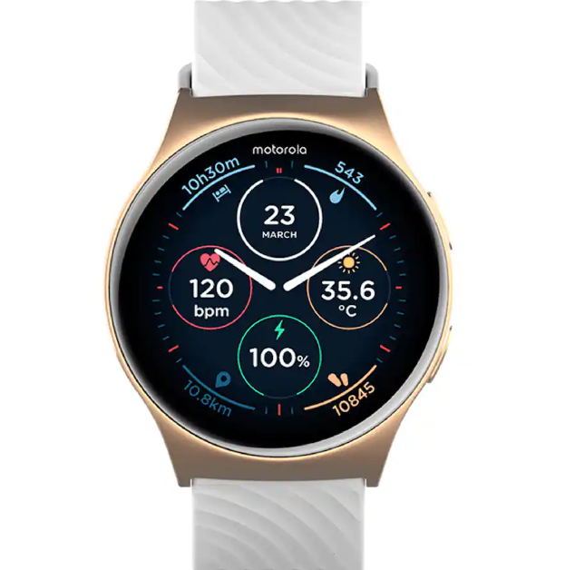 Motorola Moto Watch 120 - A Perfect Blend of Style And Functionality. Premium style that meets all day-comfort. Featuring integrated AI functionality on a vibrant AMOLED display, with advanced health monitoring features. Product Features: Battery - Up to 10 Days Battery Life. Charging should be the last thing on your mind when thinking about your watch. The moto watch 100 pro features 10 day battery life under normal usage conditions. When it’s time to charge, your watch will notify you, and it only takes 60 minutes to bring it back up to full charge. Calling - Elevate Productivity and Connectivity. Stay effortlessly connected on the go with hands-free calling on our smartwatch, ensuring crystal-clear communication, while the built-in virtual assistant adds an extra layer of convenience to streamline your daily tasks. Metrics - Measure Your Daily Vitals. Follow your vitals in one place with 24/7 tracking. From step count to heart rate, including advanced sleep tracking with nightly REM, deep, and light sleep updates. Display - Vibrant Always-on Display. Immerse yourself with a vibrant 1.43" AMOLED display, offering stunning clarity and contrast, complemented by an always-on ambient mode for seamless convenience. Customize your watch face in a 100 different ways with custom photos and layouts. Google Fit - Made for Google Fit. A deep integration with Google Fit, the #1 android health platform. Send your daily effort, rest, vitals and activities directly to Google Fit, for integration with dozens of other health focused apps. Weather - Weather on Your Wrist. Get a 7 days weather summary every morning, so you can better plan your day. Charging - Rapid Charging + 10 Days Battery. Charge up your moto watch 100 Pro from 0% to 100% in 60 minutes. Watch Band - Customize Your Style. Match your daily mood with easy swap straps to make your Moto Watch totally your own. Quickly swap with any compatible 22mm strap. Screen - Always-On Heart Tracking. With 24 hour a day heart monitoring, you’ll always have a clear understanding of your heart health throughout the day. The heart rate monitors generate an ongoing chart, and help you understand how your daily activities are affecting your heart health. Screen - In Depth Sleep Tracking. Wear your watch to bed every night and get your daily sleep summary on your wrist, in your app. All sleep data also syncs to Google Fit. Product Specifications: Color: Rose Gold. Zinc Alloy Case: Rose Gold. Watch Straps: White Silicone. Display: 1.43". Case: Zinc Alloy. Connectivity: Bluetooth 5.3 & Bluetooth 3.0. Operating System: Moto Watch OS. Bluetooth Calling: Yes. AI Assistant Control: Yes. Battery: Quick Charging 300mAh. Up to 10 Days Battery Life. Water Resistance: IP68. Dimension & Weight: Dimensions: 1.99 x 1.76 x 0.43" (50.6 x 44.6 x 11mm). Weight: 0.12 lbs (55g). Sensor: Accelerometer, HRM, Speaker, Mic, SpO2. Strap Width: 22mm. Strap Length: 175 +/- 5mm.