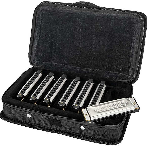 The Silver Creek Ironworks 7-Pack features a collection of 10-hole diatonic harmonicas in all the most popular musical keys — A, Bb, C, D, E, F and G. Now you can cover any musical genre in any style with outstanding tone and playability. Each harmonica offers a smooth comb and reed plate, giving these durable, hand-assembled instruments excellent long-playing tone quality for years of use. And the contoured cover plate allows for outstanding volume and deep resonance. Comes complete with a zippered, generously padded carry case to protect your musical investment to and from stage or studio.