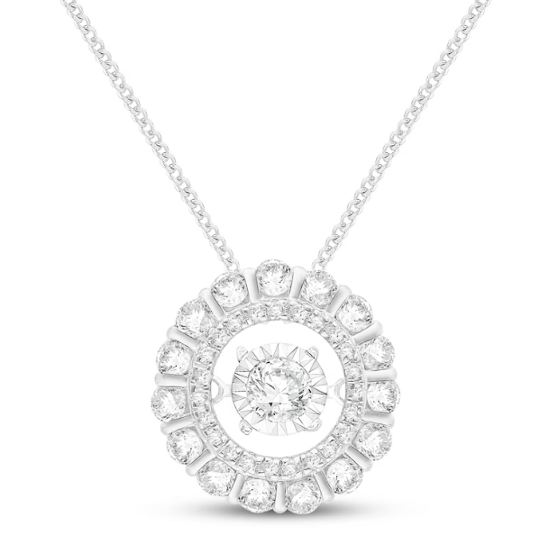 - At the center, a round-cut diamond moves and sparkles from every angle, just like your love
