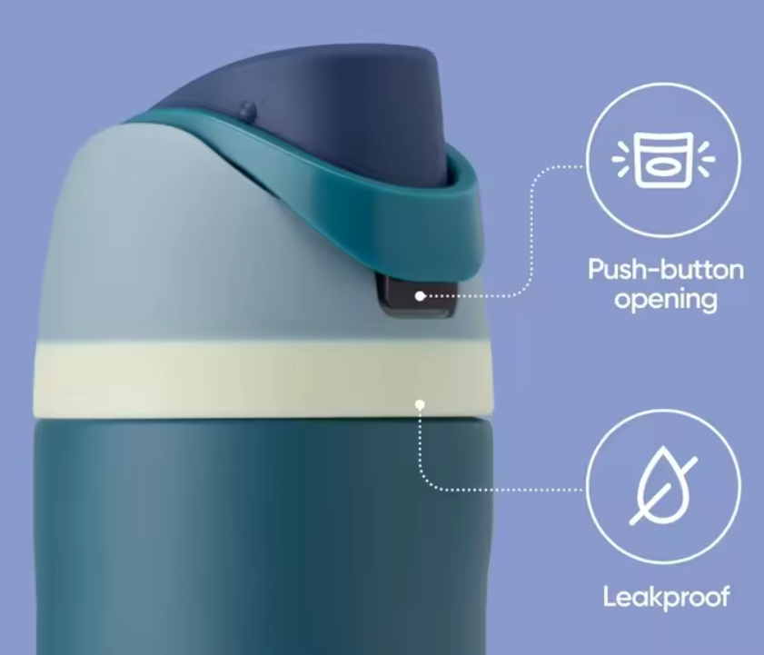 - Protective push-to-open lid keeps spout clean; convenient carry loop doubles as a lock