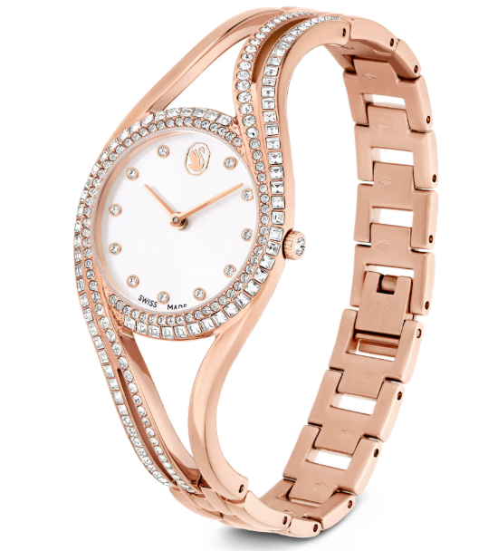 Distinguished by elegant curves and a sense of refinement, this Hyperbola bangle watch blurs the line between jewelry and timepiece. The 28mm stainless steel case is rose gold-tone finished and features a combined bezel and bracelet set with 176 clear crystals in princess and round cuts. The sunray dial also displays 11 hour markers made with crystals, along with a Swan logo at 12 o’clock. For a beautiful finishing touch, this Swiss Made watch includes a single crystal set within the crown, while offering a water resistance of 50m. It's a modern timepiece choice that combines artistry with impeccable savoir-faire.