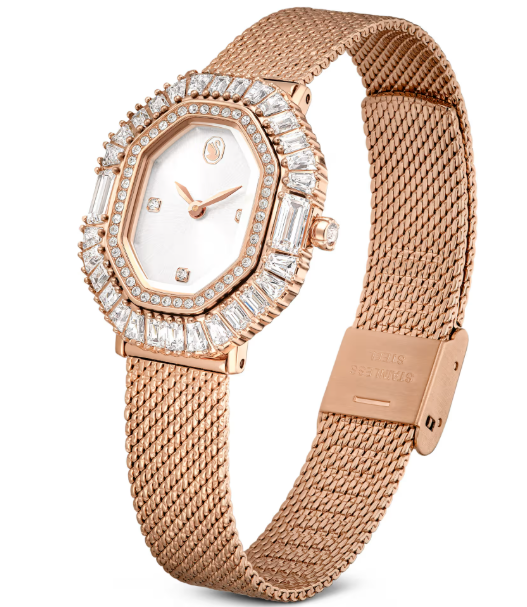 This innovative timepiece is a one-of-a-kind creation that combines signature design with mastery of light. Crafted with genuine savoir-faire, the watch is inspired by the Matrix jewelry family and features a 13 x 18 mm stainless steel case with a rose gold-tone finish. The bezel is presented in the House's signature octagon shape and is set with a stunning mix of 78 round and fancy cut crystals and Swarovski Zirconia. This provides a radiant frame for the minimalist sunray dial, which elegantly displays three crystal hour markers and a swan logo. A single crystal is also placed within the crown, while around the wrist, the luxury is heightened further by an adjustable mesh bracelet. This watch is water-resistant to 50m and symbolizes Swarovski’s modern luxury at its finest.