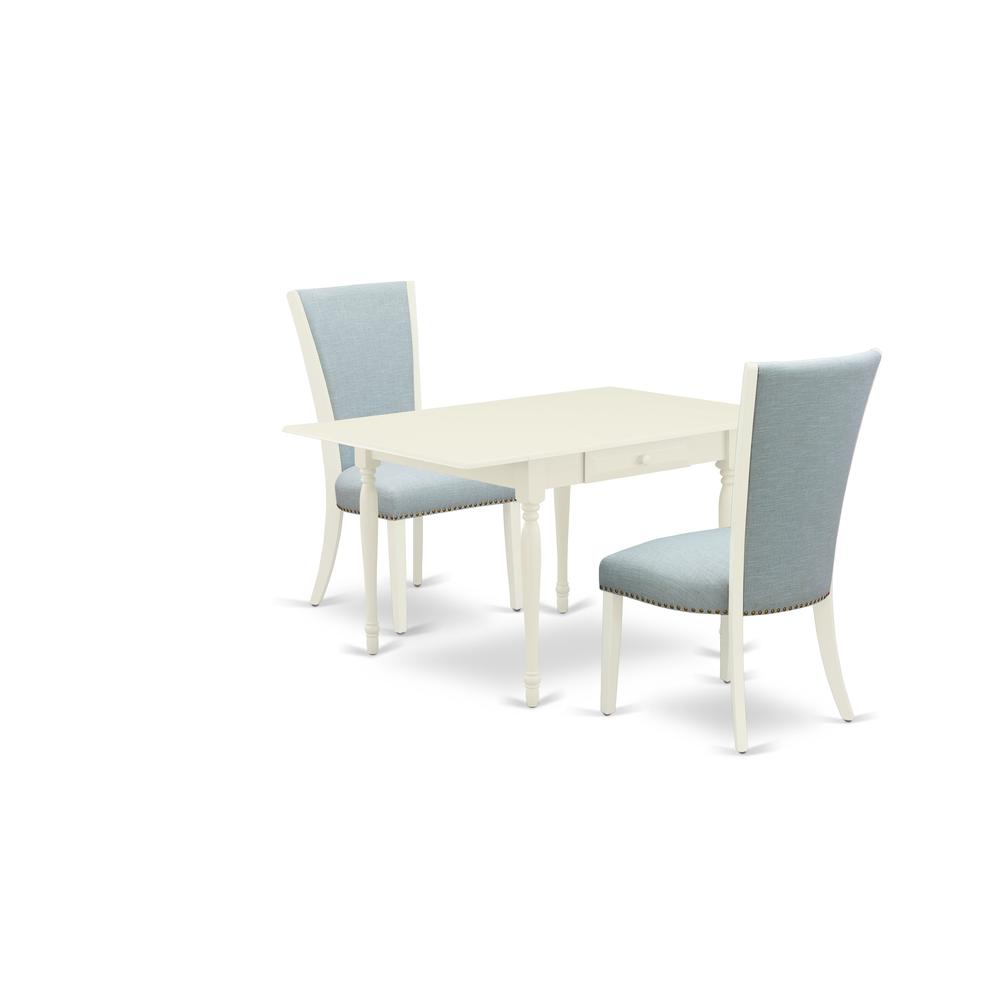 SKU:A Dinette Set Of Two Wonderful Indoor Dining Chairs With Linen Fabric Baby Blue Color And A Fantastic Drop Leaf Rectangle Kitchen Table