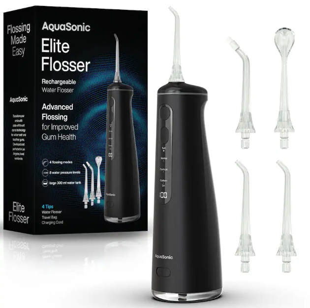AquaSonic - Elite Flosser - Rechargeable Water Flosser with 4 Tips - Oral Irrigator with 4 Modes - Portable & Cordless - Black