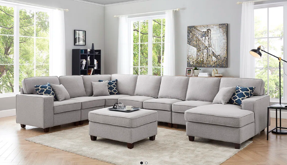 We love the streamlined styling of this 8-piece right-hand facing sectional sofa as it is an easy fit with so many design styles. The frame is made from solid and engineered wood; sinuous spring construction and foam are covered by a linen blend fabric. Slightly tapered legs, square arms, and a cushion back draw inspiration from traditional design. The chaise is ideal for relaxing after a long day or tuning into the big game, and the ottoman does double duty as a footrest or extra surface for a platter of snacks and drinks. Simply add side tables to either end of this couch and your living room is complete.