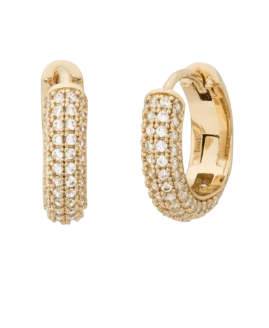 The Kate Spade Brilliant Statements Pavé Mini Huggies are small, domed hoop earrings from the "Brilliant Statements" collection, designed to be sparkly and eye-catching. They are made with a gold or silvertone plated metal and are adorned with glimmering cubic zirconia crystals in a variety of colors or in white. The earrings are often sold with a snap-post or lever-back closure for secure, comfortable wear.