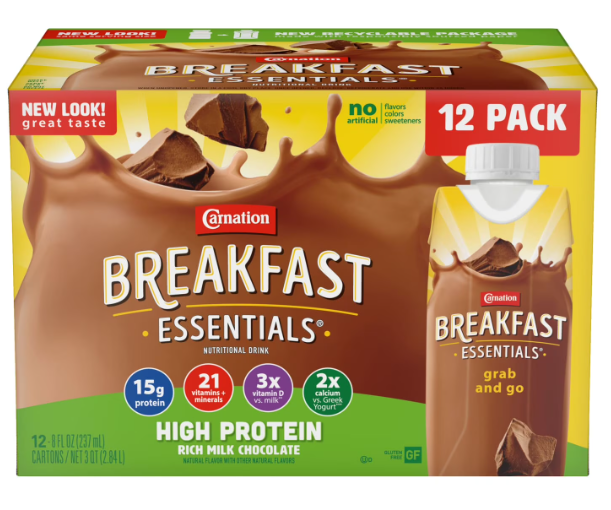 Carnation Breakfast Essentials High Protein Nutritional Drink Shakes, Rich Milk Chocolate, 8 fl oz, 12 Pack