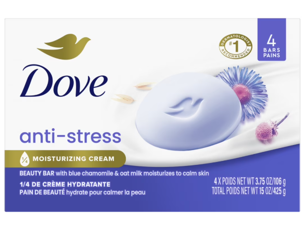 Dove Beauty Bar Women's Bath Soap Anti-Stress Blue Chamomile & Oat Milk, 3.75 oz 4 Count