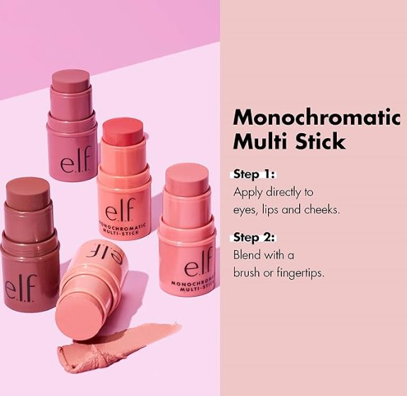 - VIBRANT, BLENDABLE COLOR: The e.l.f. Monochromatic Multi Stick is a cream-to-powder, wear-everywhere stick that delivers a highly blendable kiss of color.
