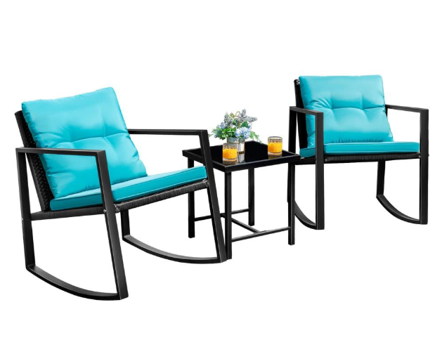 Design & Practical: The design of legs connected with seat and armrests provides extra support and balance when you rocking the chair. | Sturdy & Durable: The powder coated steel frame are rust-proof and high-quality hand woven weather-resistant PE wicker won't fade.Each seat supports up to 295 pounds. | Upgraded Comfort:The wide and deep chairs cushioned by soft padded cushions with rocking function make you forget your fatigue and enjoy your leisure time completely. | Easy to Clean: The cushions feature removable polyester covers for easy cleaning;Tempered glass on the table adds more convenience to clean if any drinks drops on it. | Widely Used: The set is simple and stylish,it will be perfect for decorating your yard, poolside, balcony, patio and home.You will enjoy your leisure time completely.