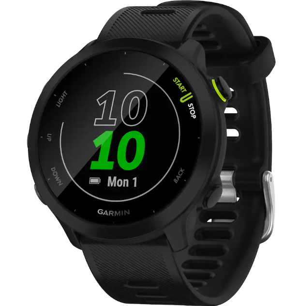 See yourself as a runner. Forerunner 55 is the GPS running smartwatch that goes beyond pace and heart rate (this is not a medical device) stats. Take the guesswork out of training with personalized guidance and daily suggested workouts based on your training history and fitness level. Change things up with HIIT and breathwork activity profiles. Advanced wellness tracking features, such as all-day respiration monitoring, intensity minutes and more, put you in tune with your body. Get more runs in between charges, thanks to this watch’s long battery life, and make it truly your own by downloading watch faces, apps and more from the Connect IQ Store (requires Garmin Connect app and Connect IQ app loaded on a compatible smartphone).