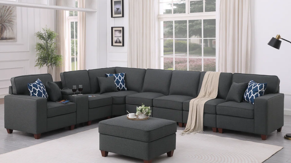 Design: This versatile sectional sofa is the epitome of modern comfort and flexibility. Crafted with meticulous attention to detail, it offers a seamless blend of style and functionality. Material: Constructed using a high-quality polyester blend material, this sofa is not only soft and comfortable but also durable, ensuring years of enjoyment. The fabric is available in two sophisticated color options: a chic and timeless dark gray and a fresh and inviting light gray. Configuration: This modular sectional is designed for customization, allowing you to arrange it to fit your space and preferences. It consists of a Left armchair: This piece serves as the starting point for your sectional, anchoring one end. Armless Chairs (x4): These versatile seats seamlessly connect and allow for multiple seating configurations. You can arrange them in a straight line or create gentle curves, ensuring the perfect fit for your living area. Corner Chair: The corner chair is the pivotal piece that enables you to create right angles and L-shaped configurations.Right Arm Chair: Completing the sectional, this chair bookends the opposite side from the left armchair, creating a balanced look.Ottoman: Included with this sectional is a matching ottoman, offering additional seating or a comfortable footrest for relaxation.Pillows: To enhance your comfort and style, this sectional comes with three matching color toss pillows that complement the sofa's design. Additionally, there are three blue and white colored toss pillows for a pop of contrast and added visual interest. Features: Cup Holder Section: One of the armless chairs is equipped with a built-in cup holder section, providing a convenient spot for your beverages during movie nights or gatherings.USB Charging Port: Stay connected and charged without leaving your seat. This sectional includes a built-in USB charging port, ensuring your devices are always powered up. Overall, this modular sectional sofa with an ottoman offers the perfect blend of elegance, comfort, and flexibility. Whether you're hosting guests, enjoying family time, or simply relaxing, this sectional is designed to meet your needs while adding a touch of sophistication to your living space. Its durable construction, versatile arrangement options, and thoughtful features make it a must-have addition to any home.