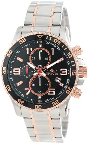 Stainless steel case with a stainless steel bracelet with rose gold-tone accents. Uni-directional rotating rose gold-tone bezel with black top ring. Black textured dial with luminous rose gold-tone hands and Arabic numeral and stick hour markers. Tachymeter around the outer rim. Dial Type: Analog. Luminescent hands and markers. Date display at the 4 o'clock position. Chronograph - three sub-dials displaying: 60 second, 60 minute and 1/10th of a second. Quartz movement. Scratch resistant mineral crystal. Pull / push crown. Solid case back. Case diameter: 45 mm. Case thickness: 13 mm. Round case shape. Band width: 22 mm. Band length: 9 inches. Fold over clasp with safety release. Water resistant at 50 meters / 165 feet. Functions: chronograph, date, hour, minute, second. Sport watch style. Invicta Specialty Chronograph Black Dial Stainless Steel Mens Watch 14877.