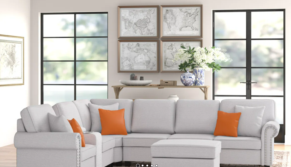 Create a warm and welcoming place to entertain with this 7-piece modular sectional. Plus, it is reversible, which allows you to configure it in the way that best suits your space. We love the traditional design elements, like the rolled arms and the nailhead trim, that give this sofa timeless, classic appeal. The frame is made from a blend of kiln-dried solid and engineered wood and has hand-tied spring construction designed for support and comfort. The removable back cushions are wrapped in foam and covered with easy-care polyester in a neutral hue. Six throw pillows and an ottoman complete this sectional.