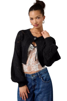 Delicate pointelle knit Kimchi Blue sweater in a shrug style. Cardigan shrug designed in a boxy & cropped fit featuring a crew neckline with a single button closure, balloon sleeves, ribbed trims through and a tie-back detail for a femme finish. Perfect for layering with camis, blouses and dresses! Only at UO.