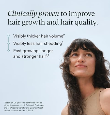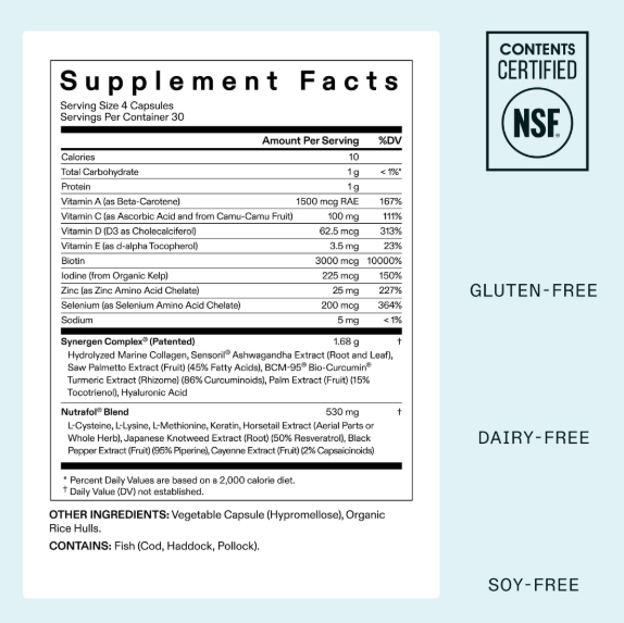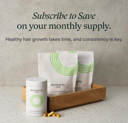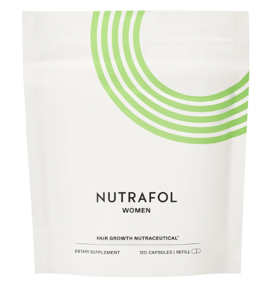 Nutrafol Women's Hair Growth Supplements contain a proprietary blend of 21 vitamins, minerals, and natural ingredients, including Ashwagandha, Marine Collagen Peptides, and Tocotrienol Complex.