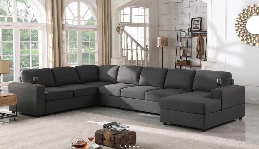 We believe everyone should live in a home they love and feel comfortable in, and let’s complete your living room with this elegant, transitioning between modern and traditional, contemporary modular sectional with chaise wonderfully complements any decor. This collection showcases spacious seating with comfortable cushions, two convenient removable glass holders embedded in the square solid arm, and low-profile plastic feet to provide the living room with a mid-century modern touch.