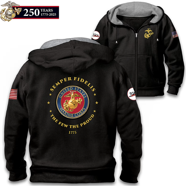 - 250 years of honor, courage and commitment in the USMC is celebrated with The Few, The Proud Men's Hoodie, a fashion design original available exclusively from The Bradford Exchange